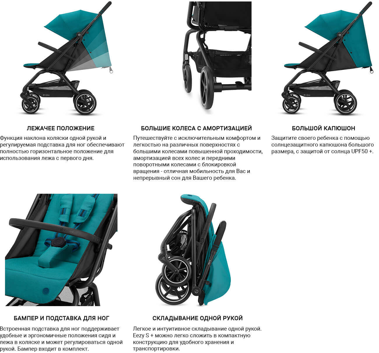 - объемный капюшон стандарта UPF50+ надежно защищает малыша от ультрафиолета и непогоды даже при полностью откинутой спинке.
